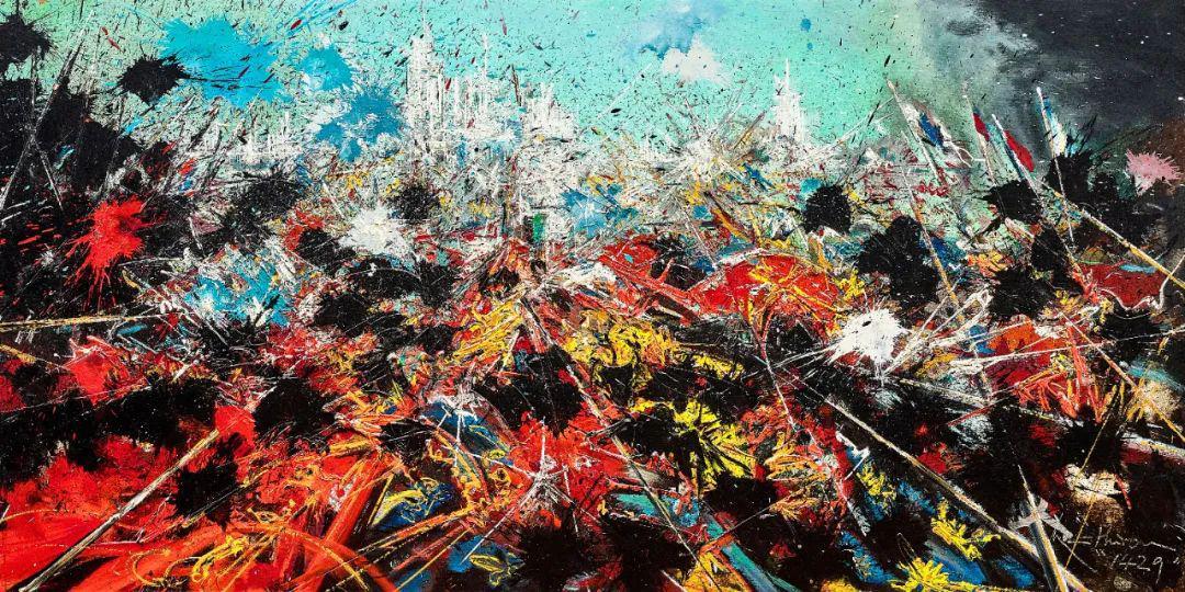 萧勤的艺术立足战后抽象的历史浪潮,不仅呈现探索宇宙的热情,更蕴含生命循环的感悟。《协奏—5》以天高地广式构图、大幅度的动态韵律呈现生命的意境;带状蜿蜒的灿烂色面若银河璀璨,表现生命「此际」与「彼端」相互依存、相互转化的关系。天人之隔不过是时、地、形相之别,当生命跨越大限,即进入舒展与无限的境界。艺术家通过纯粹有力的色彩与笔触,将古典玄学及生命哲学,与现代的抽象观念转化融合,以最直观的呈现深入人心。2019年巴黎吉美亚洲艺术博物馆为萧勤举行「禅色」大展,与馆藏的亚洲宗教文明瑰宝并置对话,一时震撼欧洲艺坛,本作即收录于为该展特别出版的画册,堪称萧勤作品之典例。