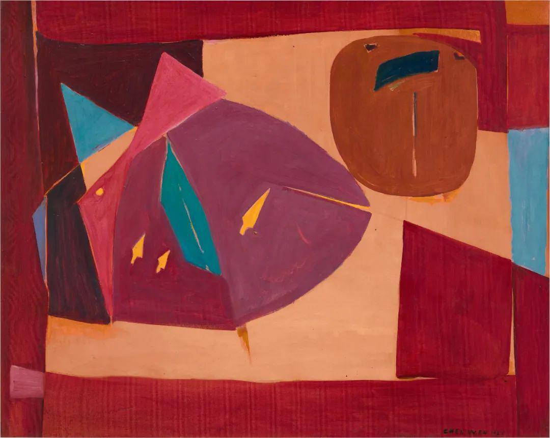 陈文希兼善油画及国画,并将各家表现手法融汇贯通,发展出自成一格的新风。他的抽象油画尤其受欢迎,现局艺术家拍卖纪录之首三位,均是创于五、六〇年代之顶尖抽象画作。《形状》完美展现陈文希对于现代美学潮流的触觉,从立体主义、构成主义及抽象主义中撷取灵感,形成本作里以几何图像与硬边色块为主轴的构图,引导观者从最根本的视觉元素——线条与色彩,细味艺术之美;钝角与锐角的形状随兴游弋,四周仿似框外有景,而炙热火红的色彩组合,则彷佛在提示着南洋炎暑的季节,而红调的抽象作更属陈文希的创作中罕见。