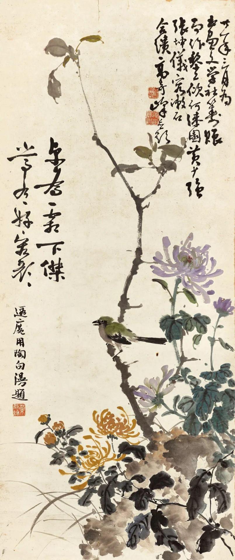 六家合作,取相同花鸟题材入画,以应求画者,如现藏香港艺术馆之〈群力回春图〉,皆出于此机缘。惟本幅写毕后却未易手,由张坤仪保留在侧,并倩同期访港之叶恭绰添题志记。