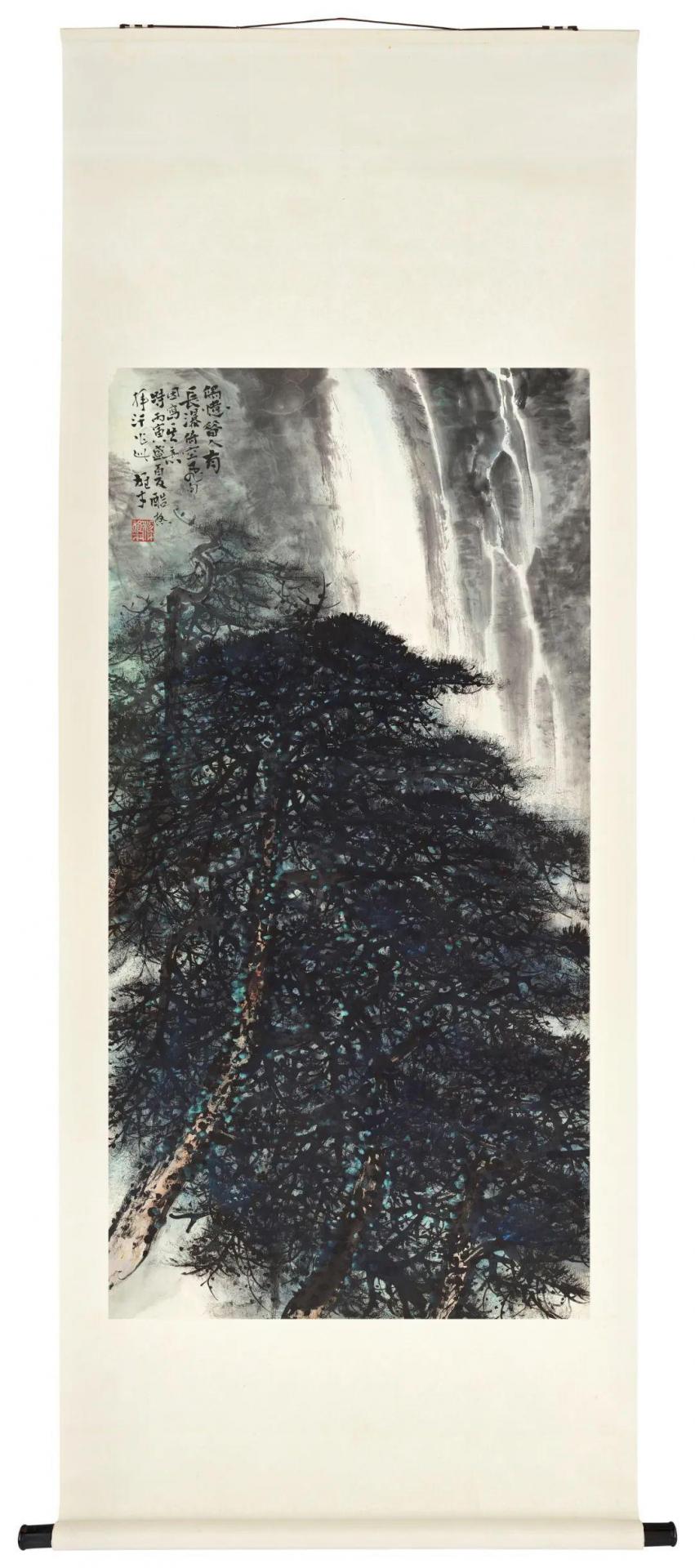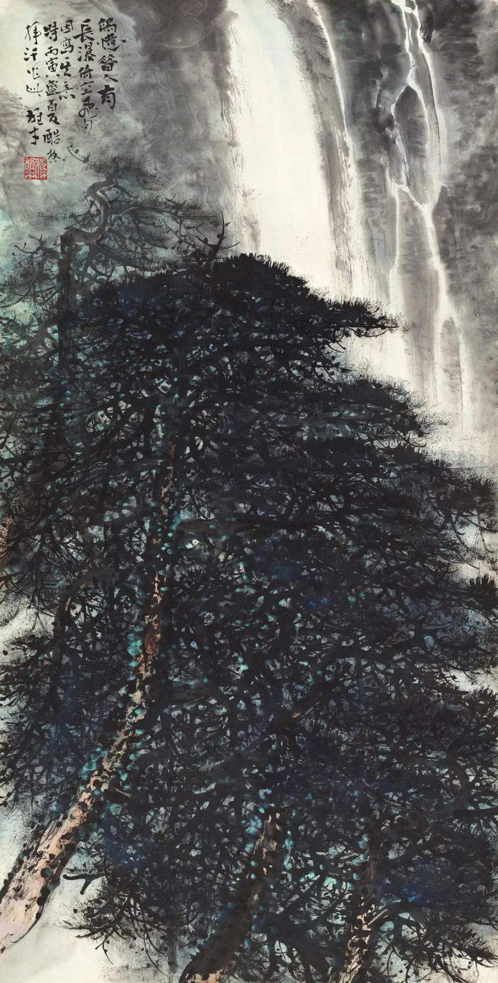 款识:偶忆昔人有「长瀑倚空飞」句,因写其意。时丙寅盛夏,酷热挥汗作此。雄才。