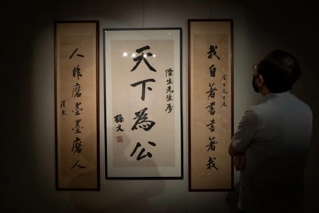 「天下为公」出自〈礼记﹒礼运篇〉,乃孙文治世思想之本及毕生奋斗目标,亦是他最钟爱书写之内容,具上款者,不乏写予冯玉祥、张学良,以至日本友人。本幅近四尺整张,实属其作品罕有,笔大如椽,气势磅礴。书「天下为公」贻赠黄氏,既诠释共同理想,亦是对其襄助革命的嘉许。