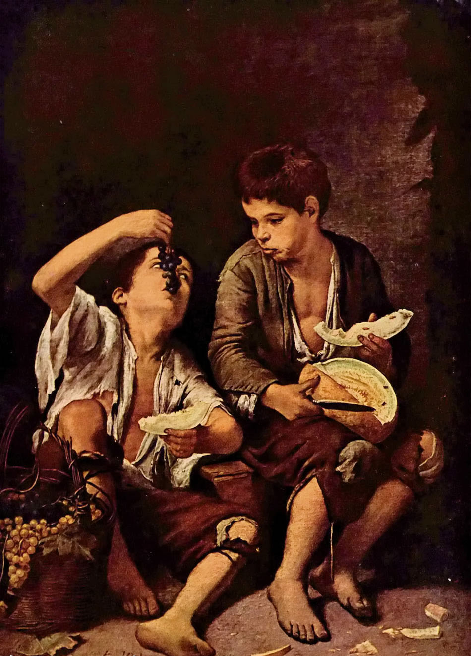 牟利罗作品中有许多是描绘下层人民生活的,《吃西瓜的孩子》可以说是他的代表作。一般为人所熟知的是宗教画,如《云中的圣母》、《圣家族》等。