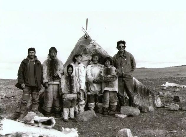 从左到右:Norman Cohn,Pauloosie Qulitalik,Lizzie Qulitalik,Mary Qulitalik,Rachel Uyarashuk,Jonah Uyarashuk,Zacharias Kunuk,在Nunaqpa (Going Inland)上,1990年