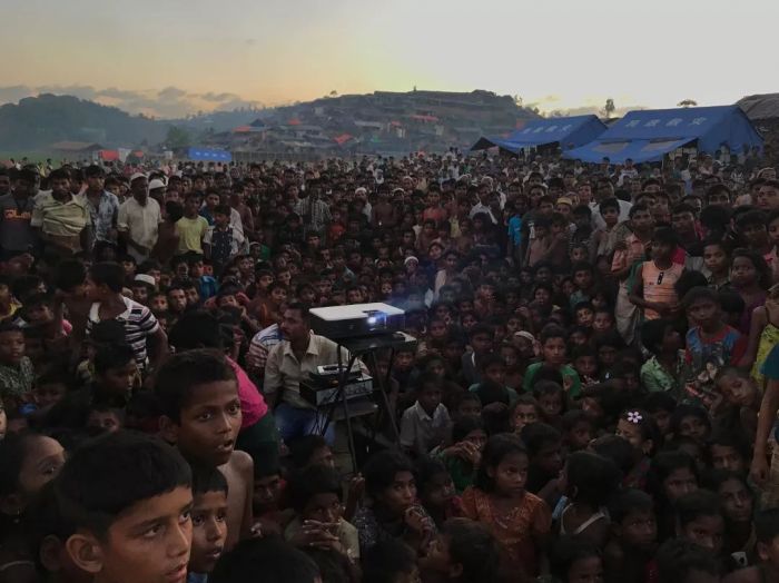“在Ukhiya的Tangkhali难民营附近,罗辛亚儿童正在观看一部关于健康和卫生的宣传电影。”