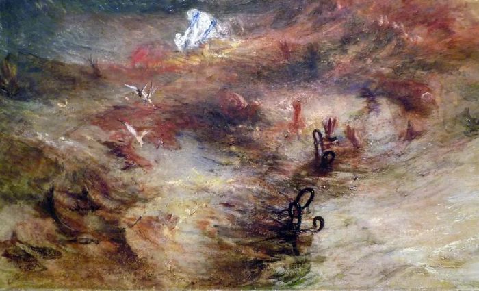 可以说,从透纳的第一幅油画开始,海洋,就成为了他一个充满标志性的绘画主题,从各种角度、维度、情绪出发,展示出了特纳作为一名画家那广泛而博大的雄心壮志。他拒绝成为一个服务权贵阶级的传统画家,他像是抱着一颗地质学家和航海家的好奇心与勇气,在接下来的几十年里,反复地琢磨、展现、刻画、渲染出大海与星辰的壮美辽阔。而他的作品在海洋主题的描绘基础上,也如历史画一样的多元,融入了文学和神话的影响,总是把自己对于人类精神的评价与自然的景观紧密结合,由此挑战了传统绘画大师的风格,并在绘画技术上取得了快速的进步。
