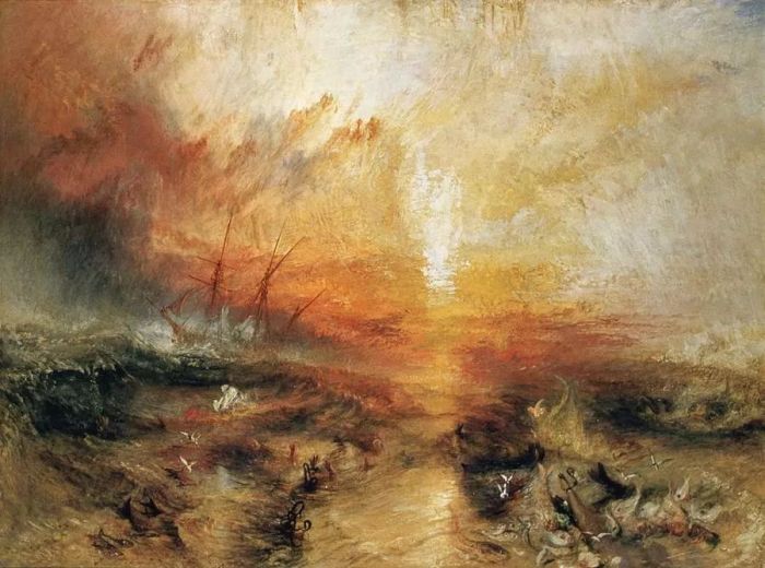 在1840年展出的《奴隶船》,就是一个绘画历史中最为震慑人心的画面,也是艺术家对海洋力量的迷恋的一个最为突出的例子。这幅画是根据一首诗歌作品完成的,而这首诗的内容描述了一个关于奴隶船的真实而悲催的故事:狠心的船长在1781年,把船内已经生病和濒临死亡的黑人奴隶抛出了船舱,以便可以得到一份海洋保险金。一方面,这幅画的风景部分渲染,让画家描述了他看到和想象的一种大自然的无穷力量;而另一方面,血红色的天空,也让画家表达了自己的情绪,反思了人类文明的行径。