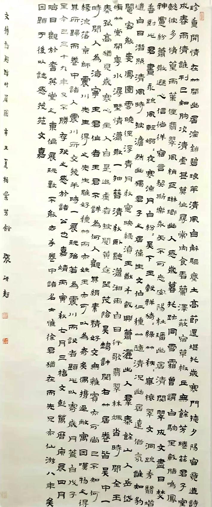 最能反映砚超的书法艺术境界的是他的隶楷,他将楷书的笔法、隶书的笔势、篆书的笔意融进隶楷,自成一体,别具一格。其点画似隶似楷,亦行亦草,长横和竖钩都呈隶书笔形,而撇捺的笔姿又常常近于魏碑,分外苍劲、灵秀。古拙淡雅,有一种真率天成的韵味和意境,令人爱不释手。