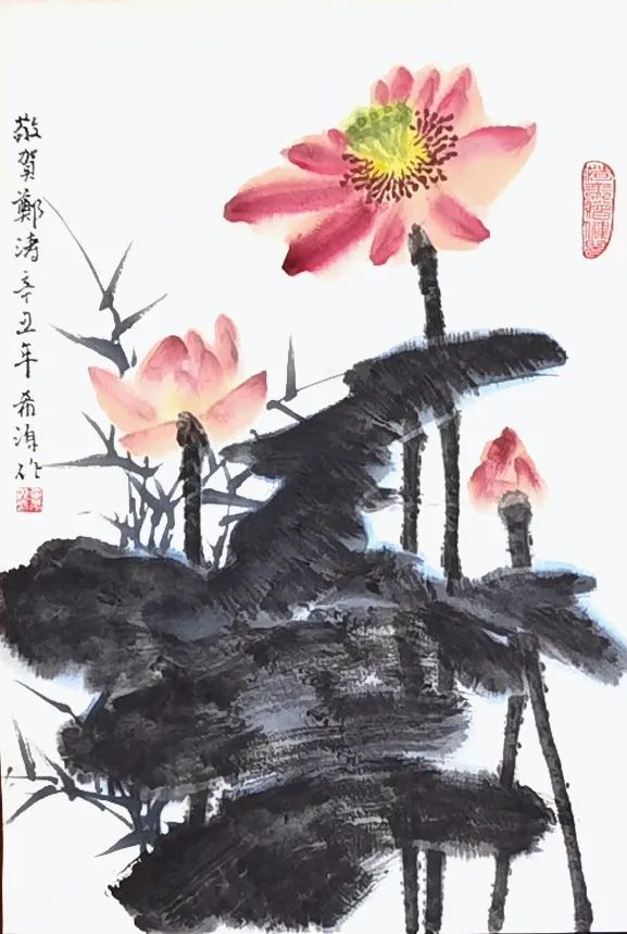 “两个系列创作,分别以荷花和梅花作为主题,也是经过我认真构思后作出的决定。”董希源介绍,荷花,是受到历代文人广为吟咏的高洁之花。既具有“出淤泥而不染,濯清涟而不妖,中通外直,不蔓不枝,香远益清,亭亭净植,可远观而不可亵玩焉”的特质,也是传统花鸟画的常见图式。“郁郁葱葱绿叶中,一枝红荷映天穹。仿佛是一位残奥健儿,傲然奋斗在赛场,赢得奖牌,更赢得人生!”