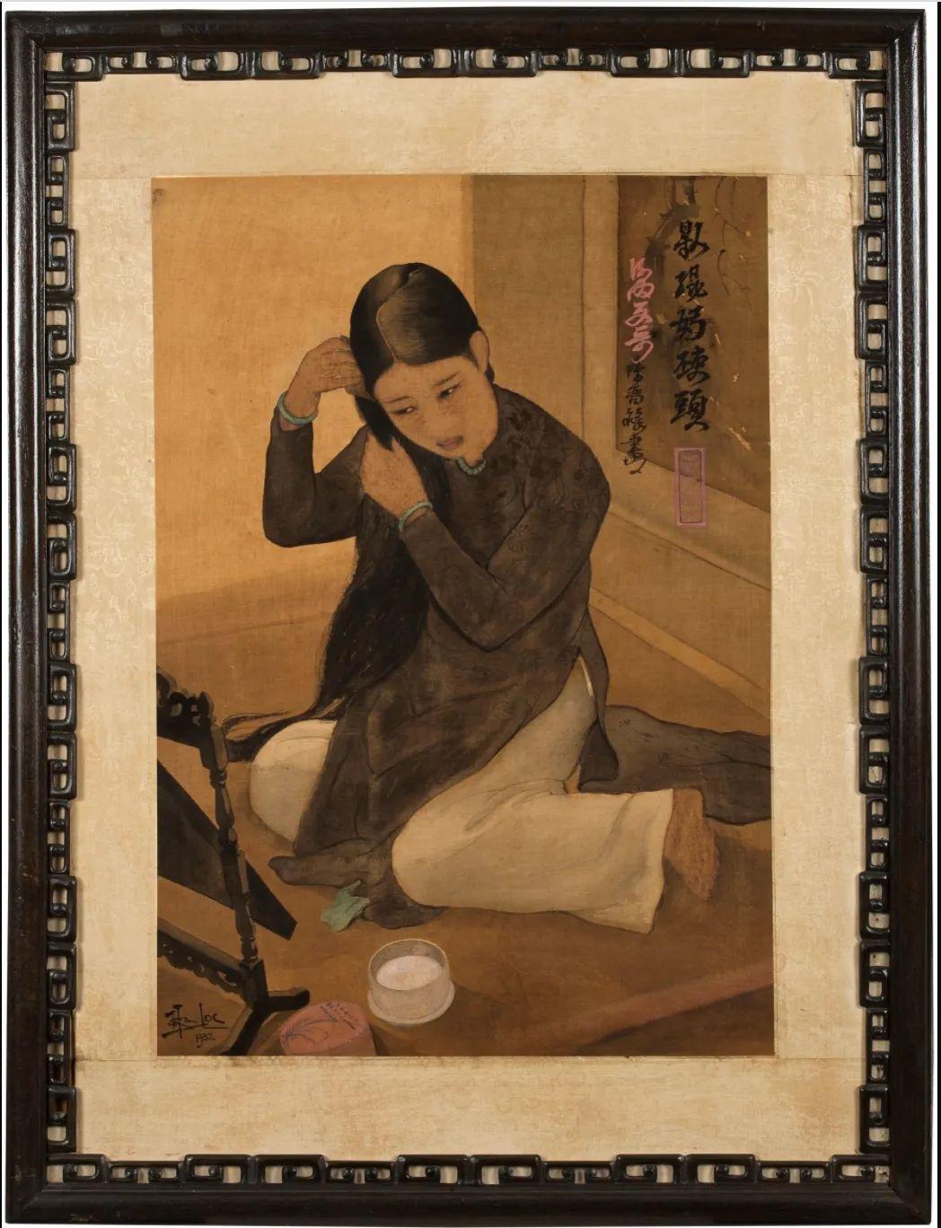 陈普禄生于1906年,是一位越南艺术家,20世纪50年代在河内的美术合作社担任插画师一职。《梳头发的优雅少妇》表现的是亚洲传统艺术主题 – 描绘美丽女性梳妆打扮的形象。有说画中所绘是画家弟妇的肖像,此乃迄今已知陈普禄唯一一件绢本水彩水墨作品。绢上作画是1930年代河内美术学院尤其注重的一种特殊技巧。