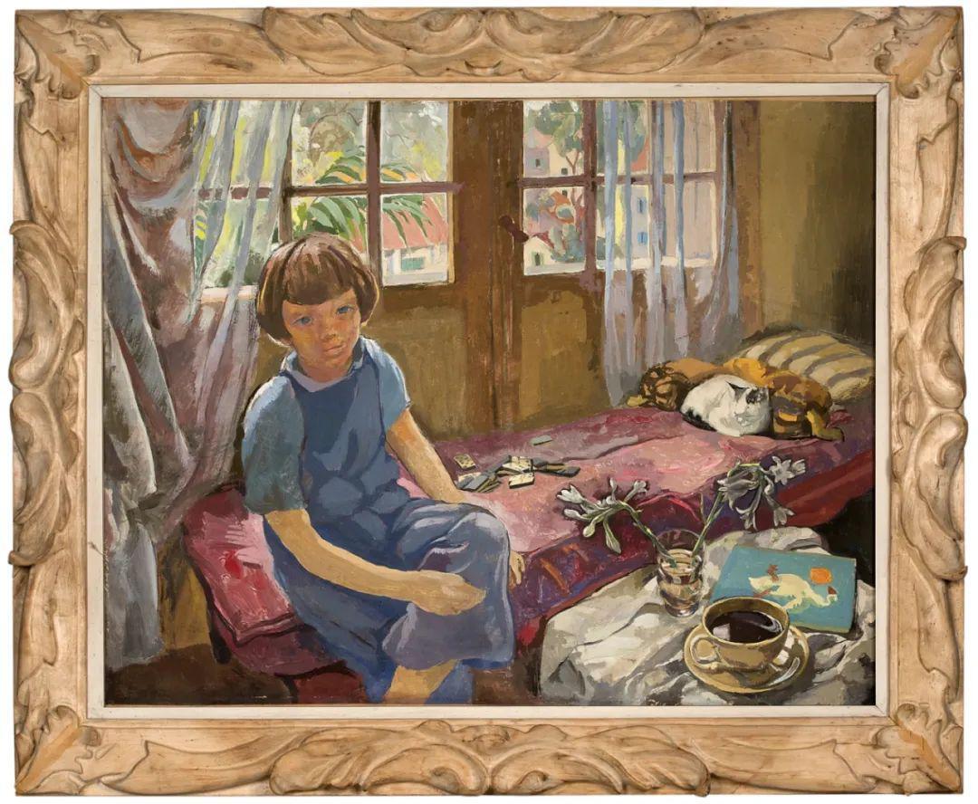 阿利克斯·艾梅Alix Aymé,师从法国那比派画家Maurice Denis,对中南半岛文化及漆画技巧充满热情。《画里的猫和孩子》描绘了她的工作室,画中孩子乃艺术家的儿子,正充当模特。