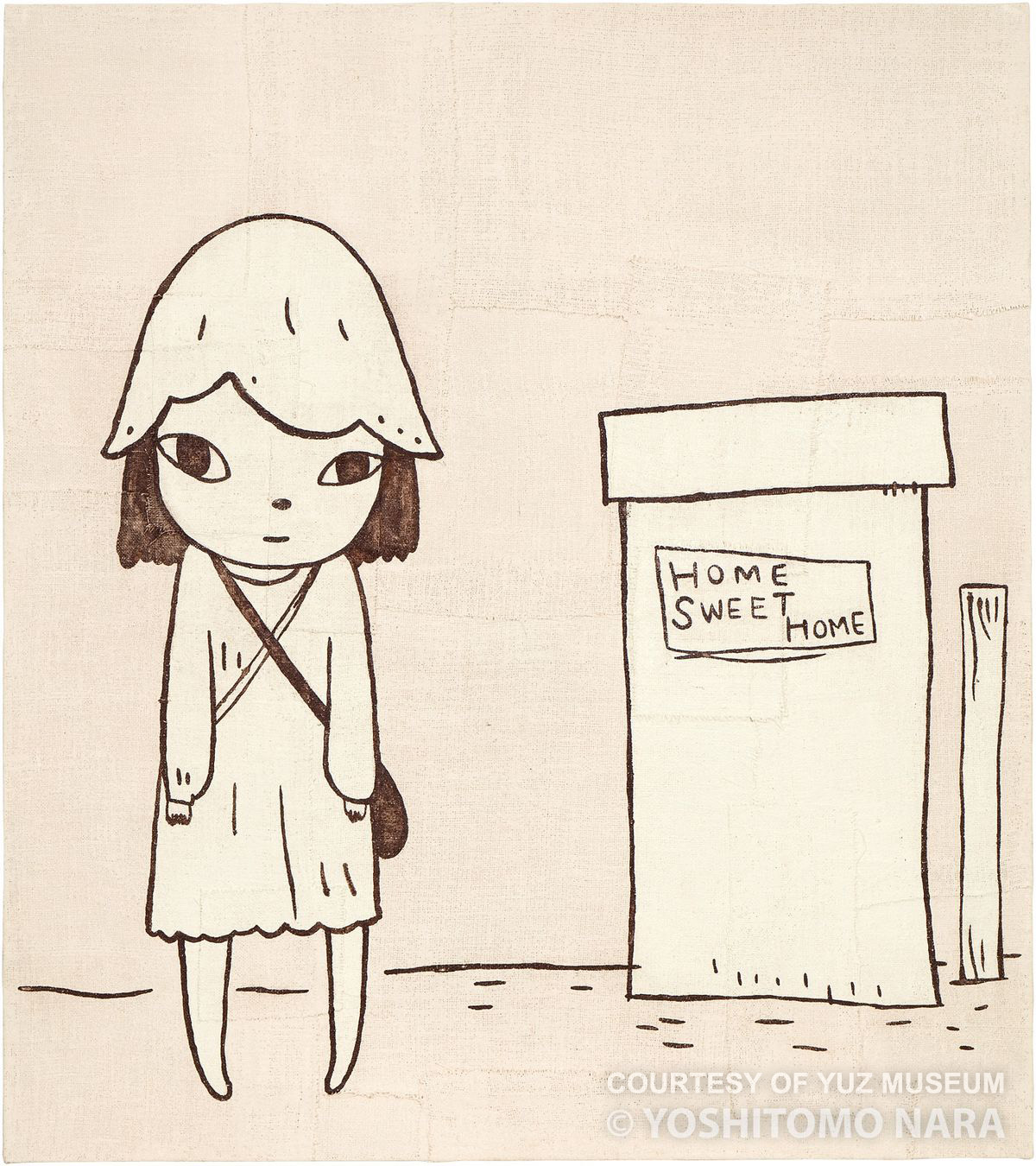 在当下观看奈良美智的作品,反战与反核元素或许特别值得注意。奈良美智从小就感到自己与战争贴得很近并因此梳理了鲜明的反战态度。在创作于2017-2019年期间的“广告牌”绘画系列中有一幅题为《和平女孩》的作品,女孩踩在希特勒的头颅上,面露狰狞。奈良美智对此的解释是,““站在二十世纪最臭名昭著的独裁者身上,为什么和平女孩的脸上看起来有一种恶意?你越去思考和平是如何形成的,它似乎就变得越复杂。”