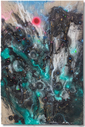 下一件作品《自然重力80》,这件作品来自一位年轻的90后艺术家陈英杰,将中国泼墨画和街头涂鸦结合的淋漓尽致让人过目不望。在全球疫情爆发、周身环境停滞的时代,通过新的作品,重新思考人和自然的关系。