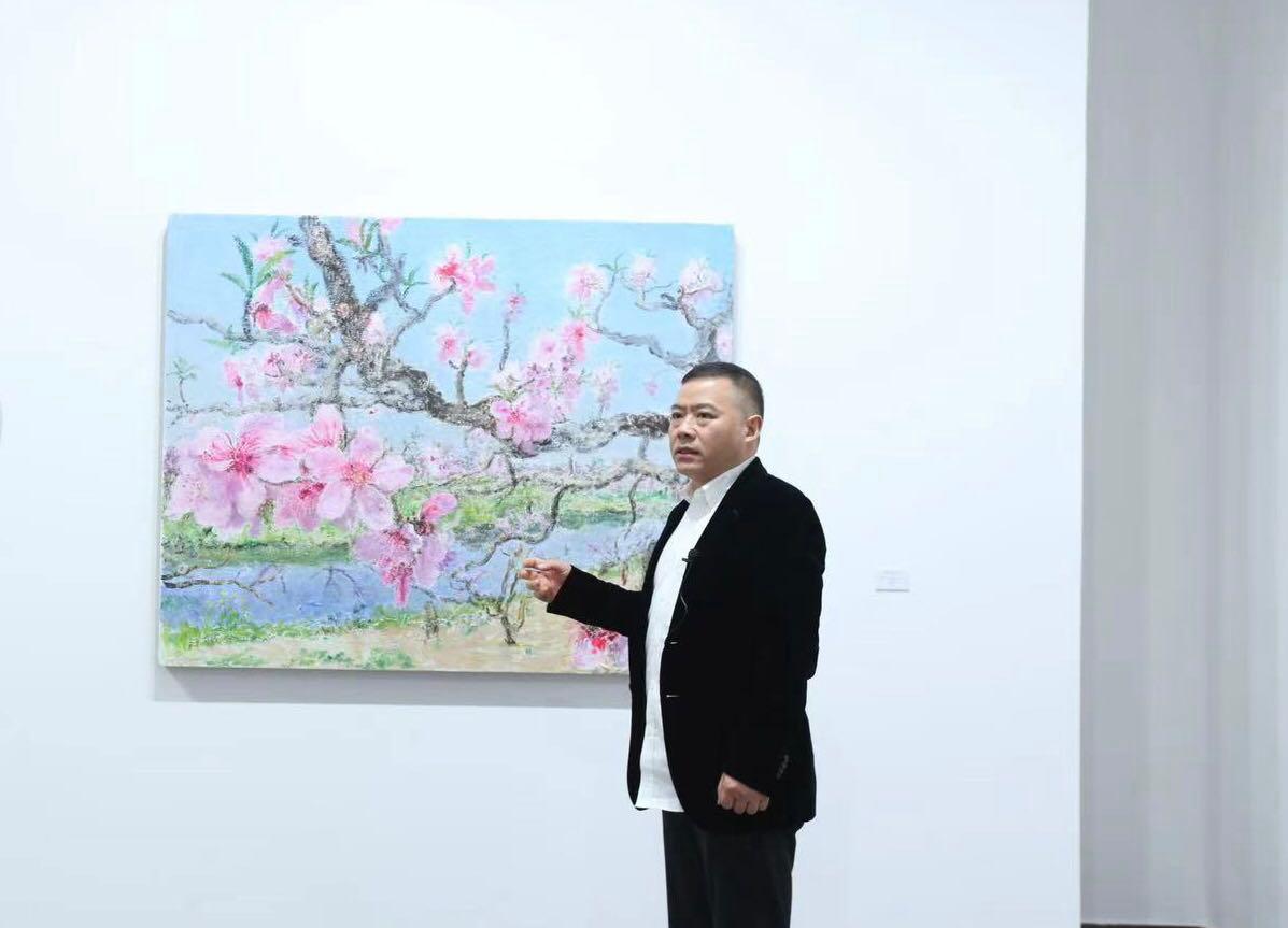 K空间创办人杨凯在周春芽的作品前接受采访