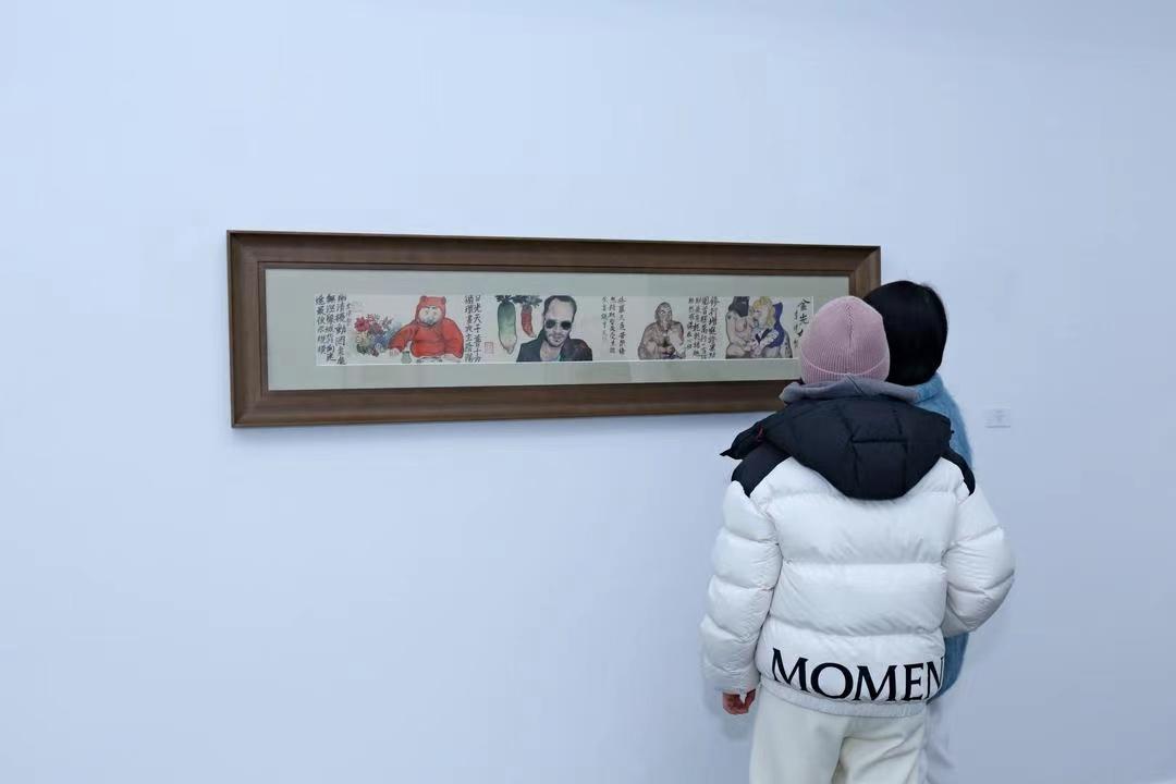 观众在李津的作品《金光妙品》前驻足(纸本水墨 17×136cm,2020)