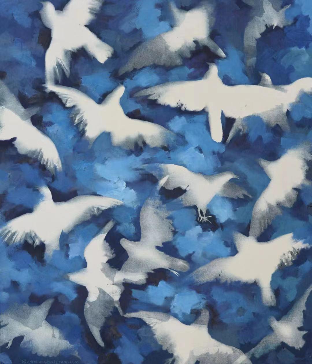 张大力《鸽子》( 蓝晒油彩 125X144cm,2014-11)