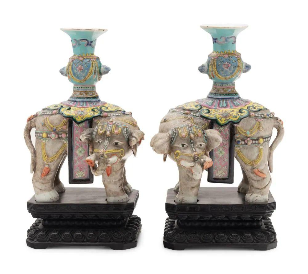 一对19世纪晚期的中国粉彩瓷象形烛台