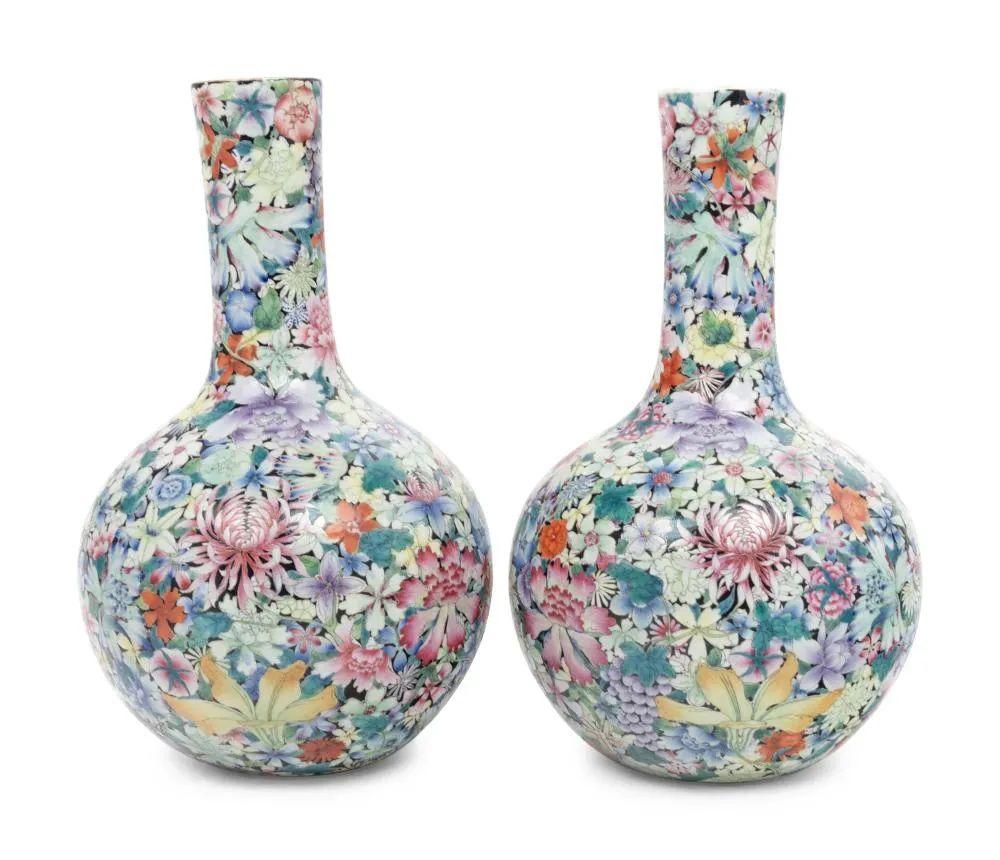 No.418 晚清/民国 粉彩百花不落地长颈瓶一对
