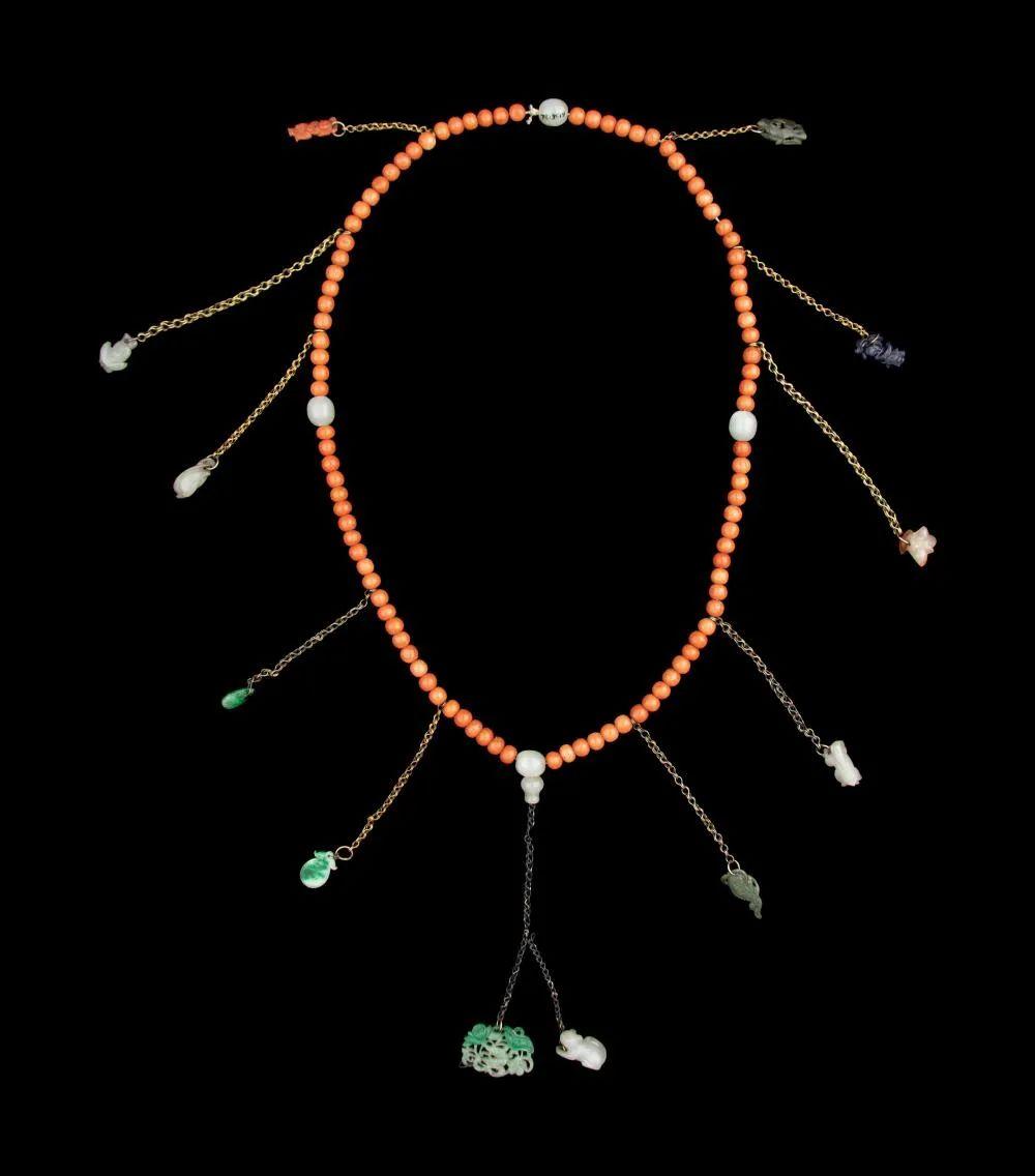 中国珊瑚、玉石和硬石项链