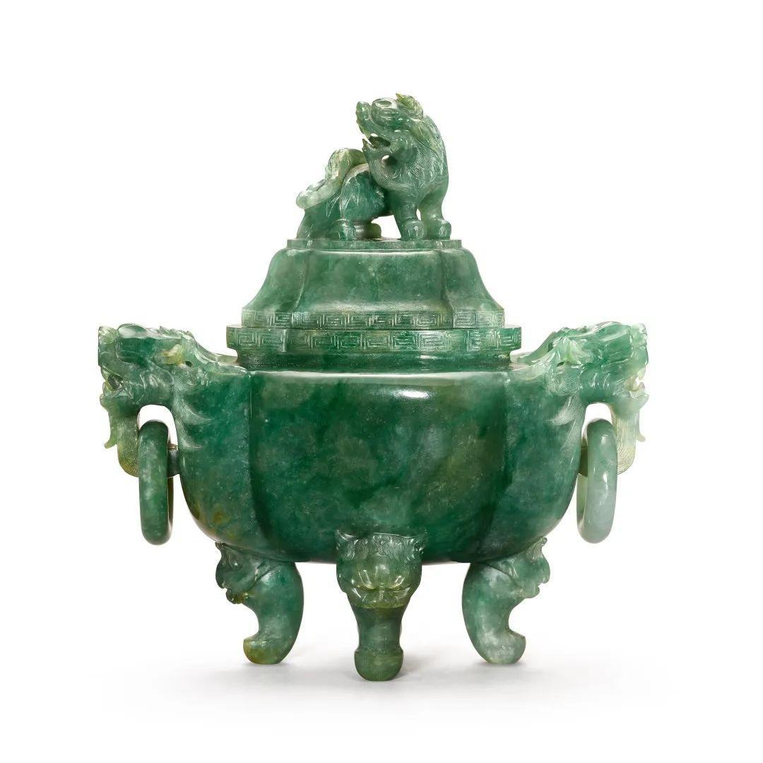 01清 翠玉瑞兽钮双龙活环耳瓜棱式