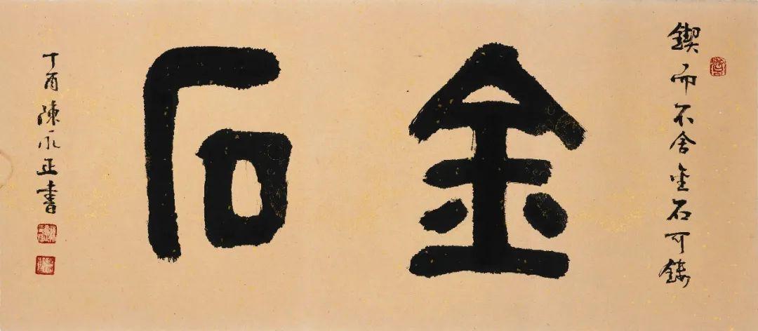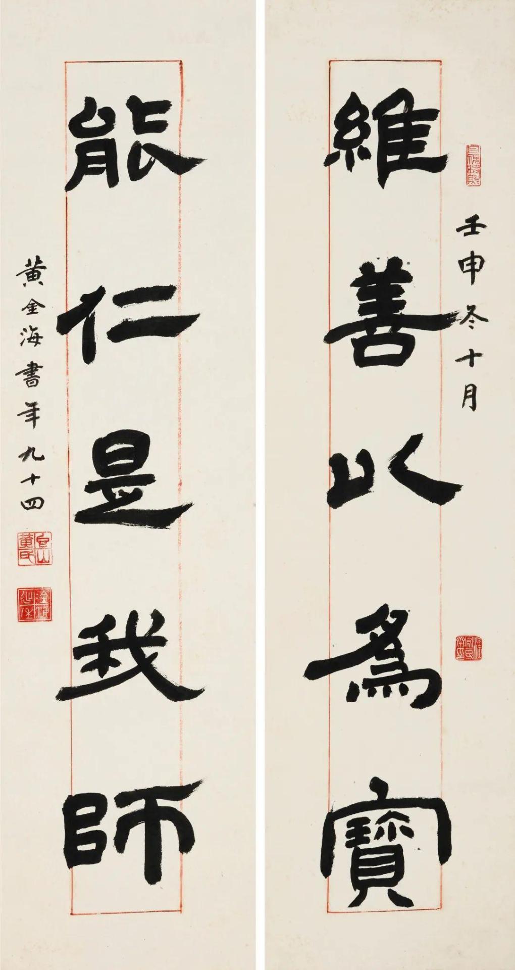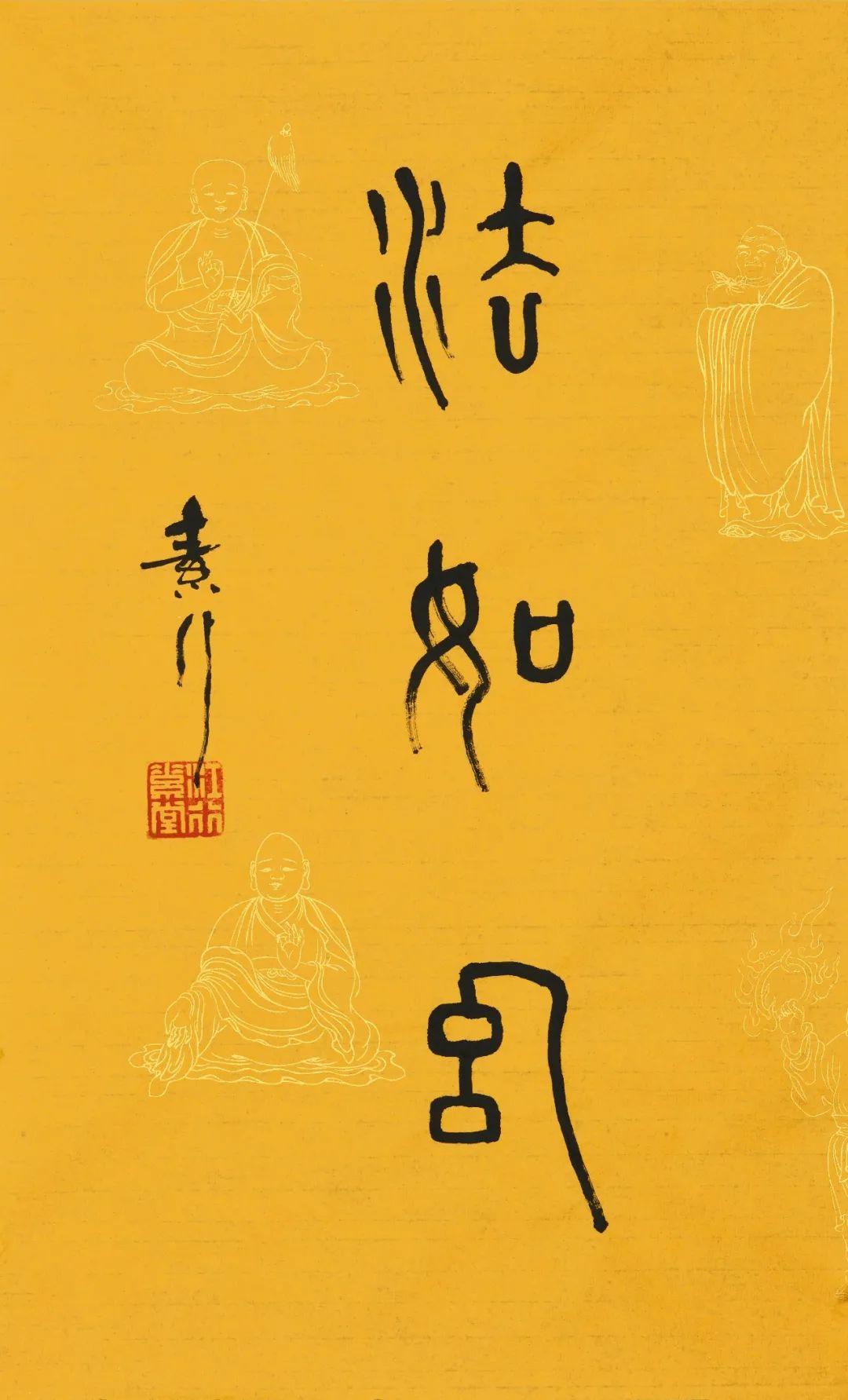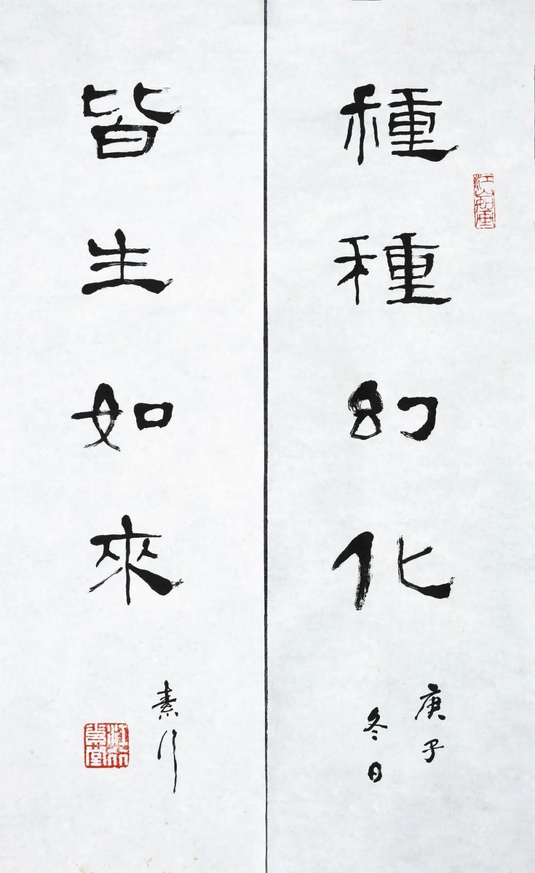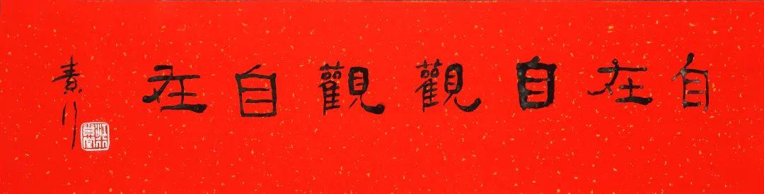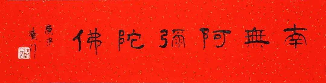 佛所言说,皆应信顺。作为书家的素行,生长于广东,自小研习汉碑及颜、褚各体,受益于赖少其、饶宗颐等名家。擅长篆隶的同时,亦善小楷。作品雅逸秀韵,别具一格。其佛语书作,可谓信手拈来,蕴含深度的哲理,尽显人生大智慧。今次汇集书法精品佳构十二幅,形制多样,诸体皆善。故作于洒金纸之《南无阿弥陀佛》《自在自观观自在》《楷书十言联》,与横幅《善缘》《无畏》,以及《隶书四言联》等,值得细细品观。