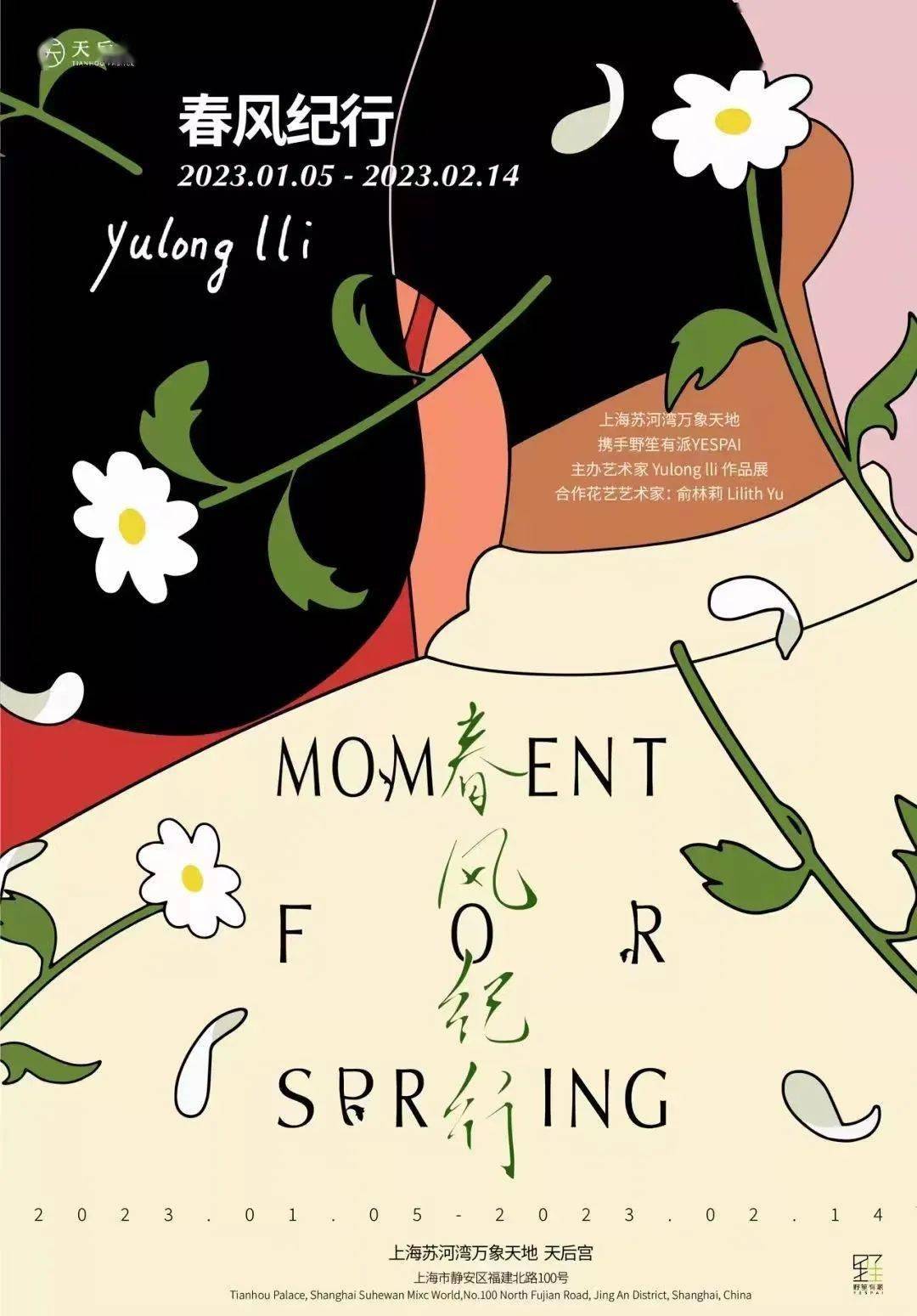1月4日-2月14日,插画艺术家Yulong Lli的作品展《Moment for Spring 春风纪行》上海天后宫呈现。举行。展览由上海野笙有派YESPAI携手上海苏河湾万象天地主办,这是始建于1883年的百年古建天后宫最新修缮后,首度呈现艺术插画展览。此次展览分为三大板块,主题包括「亲密关系」、「地缘文化与身份符号」和「日常碎片」。中国美院美术史教授云躲君亦为此次展览书写导言,她直言:“Yulong的作品都来自实实在在的生活,它们无一不愉悦,不丰盈感官,是凡俗生活的赞歌。