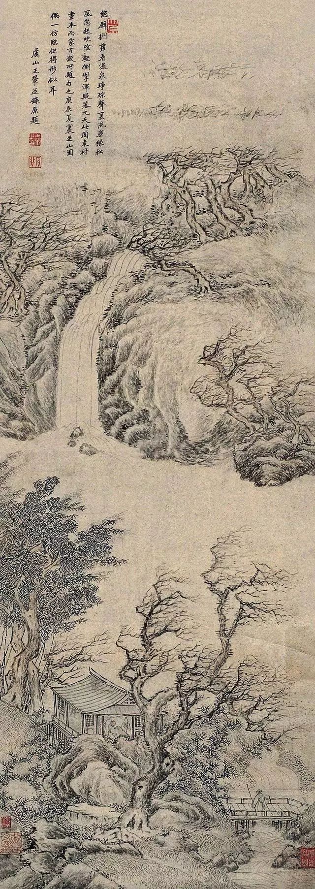 王翚自幼嗜画,继承家学,又随学黄公望画法的同乡张珂学画,很早便表现出非凡的绘画才能。王翚师从王时敏、王鉴。但他所画山水不拘于一家,广采博揽,集唐宋以来诸家之大成,熔南北画派为一炉。王翚在王时敏、王鉴发展南宗画派的基础上,借鉴北宗的某些技法,比较全面地对山水画传统进行整理,形成具有综合概括性质的法则。王翚将黄公望、王蒙的书法性用笔与巨然、范宽的构图完美地结合起来,创造出一种华滋浑厚、气势勃发的山水画风格。因而他所画的江南小景往往生趣盎然,清幽灵动。王翚作画喜好干笔、湿笔并用,而且多以细笔皴擦,画面效果比较繁密。曾说“以元人笔墨,运宋人丘壑,而泽以唐人气韵,乃为大成”。他早期画风清丽工秀,晚期则倾向苍茫浑厚。章法富于变化,水墨与浅绛渲染得法。也有评者指出王翚用笔过于圆熟,某些画则显得刻露,墨法少有变化,构图略感壅塞。