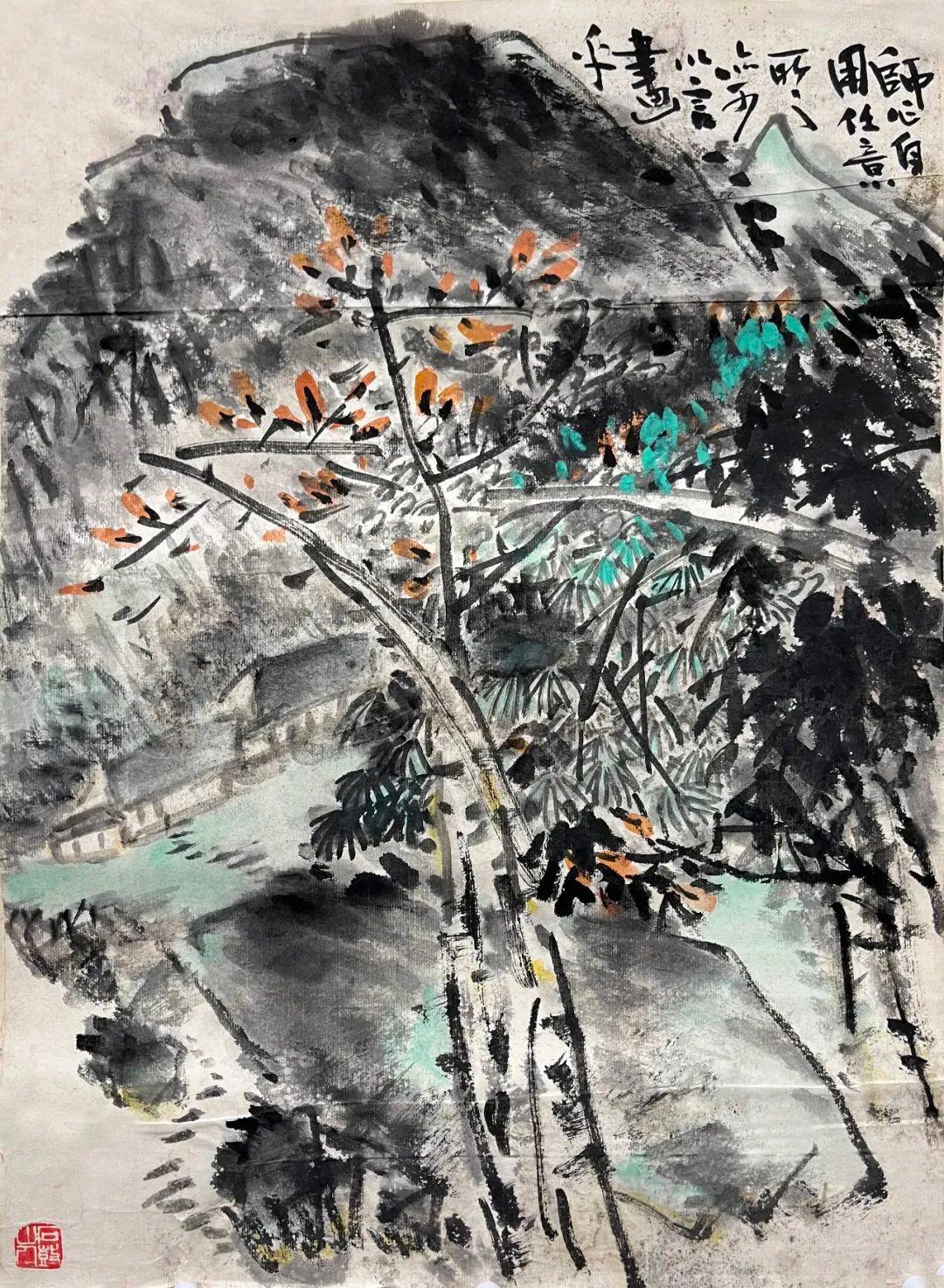 此期网拍的四季山水四屏,我们可以看出曾宓将浑朴自然之趣和天人合一之境作为自己在审美上的终极追求,整个画面流淌着发端于稚拙、古朴的天真烂漫之美。曾宓山水画中的一个突出特点便是在造境上的深冥幽谧。四幅画面皆以深重的大面积墨色铺陈,或表现暮色苍茫下的坡石堤岸,或表现曲径通幽的淡泊之姿,或是红叶纷飞的烟火之象,或是骤雨初歇的沉郁孤寂。这种放任灵性的自在笔墨,无拘无束又天马行空。从这些作品中,我们发现,在传统的脉络与根基上,曾宓先生以一种山川万物和个人体验高度融合的笔墨,表达了他充满了独特个性的生命活力。