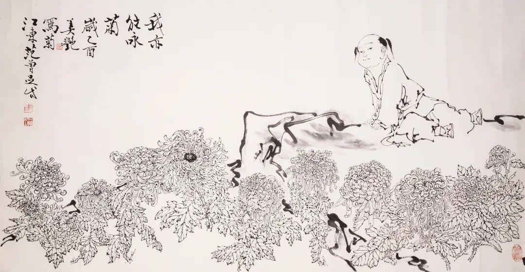 款识:我亦能咏菊。岁乙酉美艳写菊。江东范曾足成。