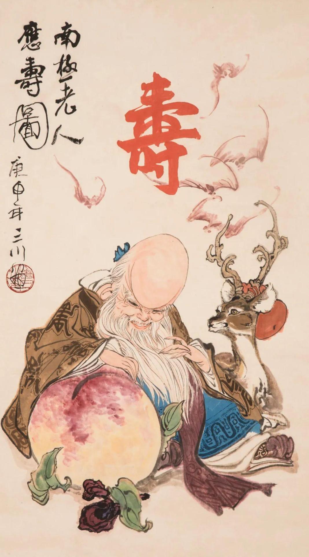 款识:南极老人应寿图。庚申年三川画。
