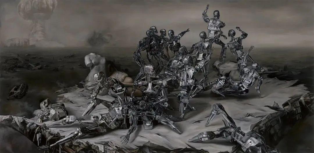在早年的油画作品中,周松将超写实技法发挥至极致。从《逆时空》到《新创世纪》,再到《质能宇宙》,他通过精准而细腻的视觉表现,利用超写实放大观念的视觉技巧,呈现出具有后人类主义特征的反乌托邦式未来世界。在貌似“冰冷”的机器和行星天体的构造背后实则隐含着一个宏大的哲学议题:作为人类,我们是如何理解自身和世界的?思维、大脑和人类机体之间的关系是什么?人与自然、存在与意识,这些经典的哲学命题在周松的作品中都有所投射。