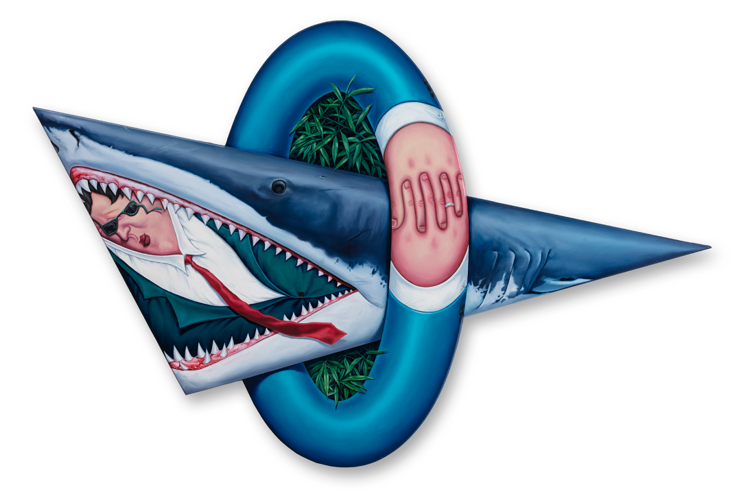 在《宇宙·精神·方程》中,鲨鱼张开了大嘴,里面是一个圆鼓鼓的人,鲨鱼似乎把他整个吞进去了。这种设计隐喻着人类和大自然作为相互联系的存在。不过,画作的标题同时暗示着鲨鱼与人的平等关系,而非支配与被支配的关系。商人十指交叉的双臂将鲨鱼以及生长的绿草围在了里面,说明他乐于拥抱后者所代表的变形以及自然。与此同时,双臂环绕的动作是一种循环的表达。手上的婚戒进一步强化了这幅画的两大主题——转变的循环,以及人类与自然生物的统一。