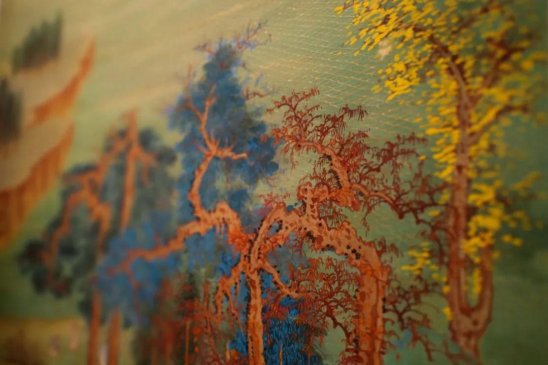 画面以青绿为主调,复以泥金增色,处理之精妙,令人称绝。江面水波用金线细钩,在阳光映照下泛现粼粼金光;天边、山廓、坡底,俱敷以泥金,灿若云锦。全图诸色辉映,眩目醉人,堂皇中流露文人雅趣。大千将没骨、青绿、金碧,共冶一炉,细笔勾金覆盖画面近半,于其作品,恐仅此而已!