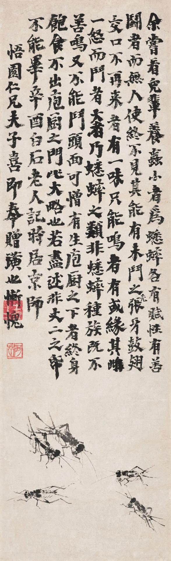 〈蟋蟀〉乃齐白石中年细笔草虫作品。长题〈画蟋蟀记〉,最早见载于齐白石〈壬戌杂记〉,内容反映画家对草虫的生态观察入微外,更隐喻着对人性的透彻理解与分析,藉蟋蟀而嘲讽了人性的种种弱点。