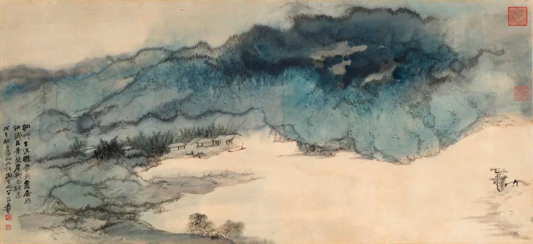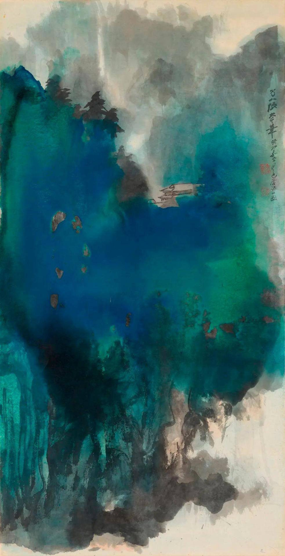 全画最引人注目者,无疑是近景、中景之间横泼出一片浓彩,沉艳亮丽:墨赭为底,石绿调少许白粉重泼之余又薄染四周,令画面雄浑而不失突兀,石青则以纯色施于石绿之上,大千尤嫌不足,最后一团浓墨置于色块左下角。诸色交融层迭,令画面顿添葱郁翠意,石色呈现出颜色变幻,如浮云积翠,如松气凝烟,绚烂至极。水色与石色质感碰撞又成各式肌理之效,或如春花绽放,或似剑锋毕露,或竟如奇石漏透玲珑,虚实相融,美轮美奂。