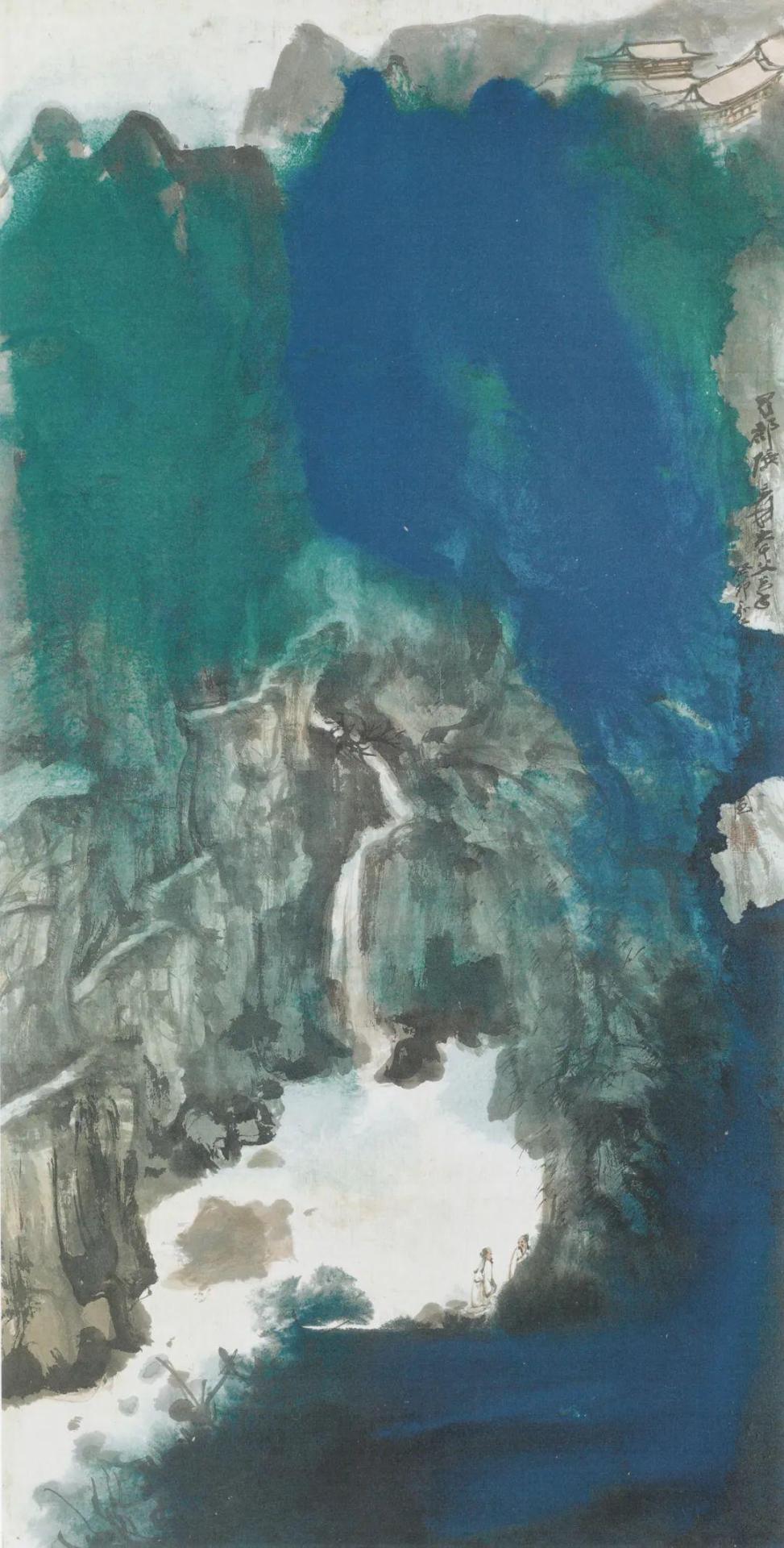 《山寺飞泉》创作于1963年大千先生居住巴西时期。用纸取紧密细润之四尺整宣,扑面直观似是范宽《溪山行旅》般的巨峯壁立,巍峨峥嵘,上干云霄,一堂雄强。然细观竟有景深之分:近景者,大千凭腕臂之力,纵横粗笔,说是皴法,已难名之,线条或直或曲,运笔中锋散锋,令人直感画家下笔之速度,心无旁骛之一气呵成;中景已是墨多于笔,水多于皴,几全然掩盖于青绿浓彩之下,影影绰绰,惟见崇冈青松,云边萧寺;远景层峦迭嶂,用淡墨调赭涂就,远山含黛,瀑落千寻,画至此处,只余轻松。