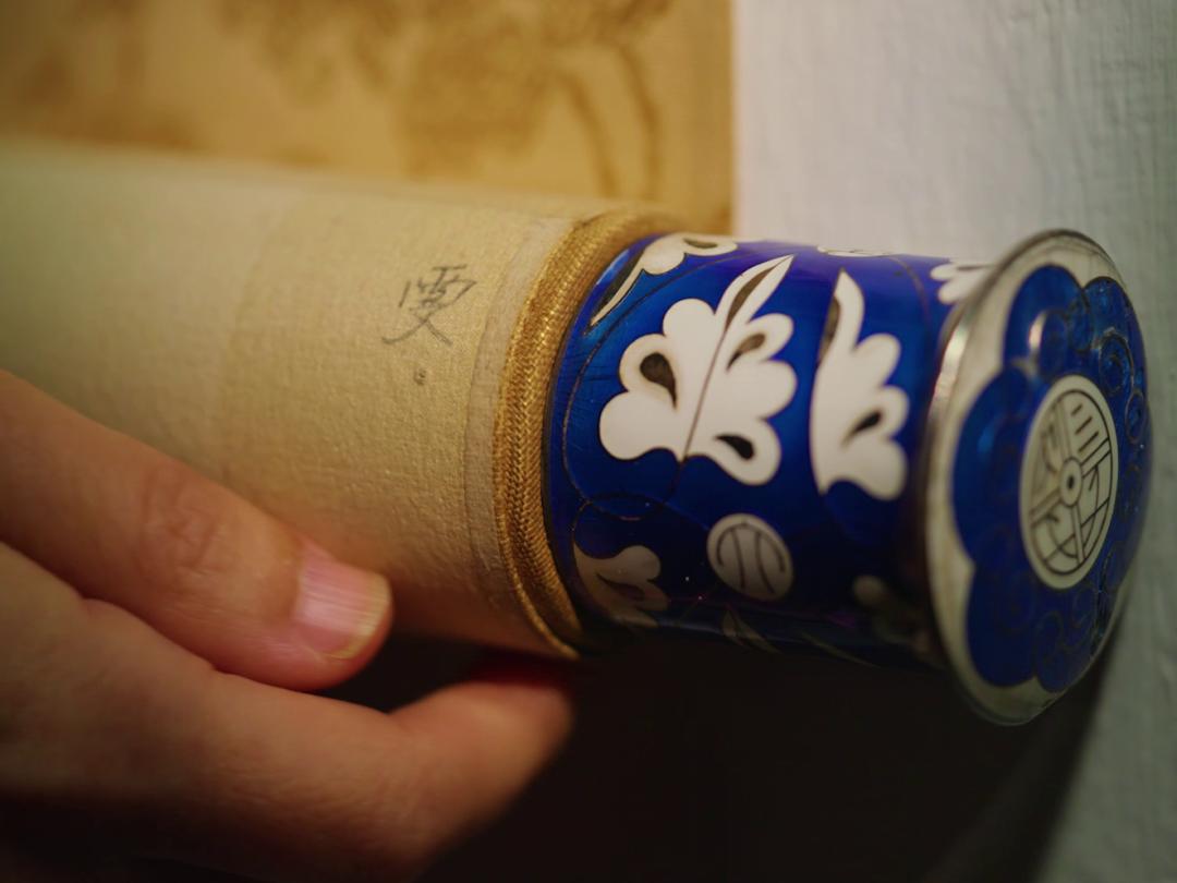 此幅装潢乃大千1960年代所用顶级日本装裱:双色裱式,天地用缠枝牡丹绫,隔水裱边用金地牡丹暗纹绫,与画中的青蓝成补色对比,明亮灿烂,顿时与中国传统追求之协调柔和拉开距离,而添当代审美之强烈;轴头采用七宝烧(即中国之景泰蓝),蓝色珐琅为地,嵌铜丝勾勒、填银白二色,纹饰则取敦煌壁画中花草图案,间插 “大风堂” 三字篆书;轴首取敦煌藻井之灵感,六瓣宝花缠枝细纹,正中乃瓦当样式 “三千大千” 字样,用心可见一斑。所见大千用此类装潢之作品,无一不是其自得自珍之作,如《碧峰古寺》等。
