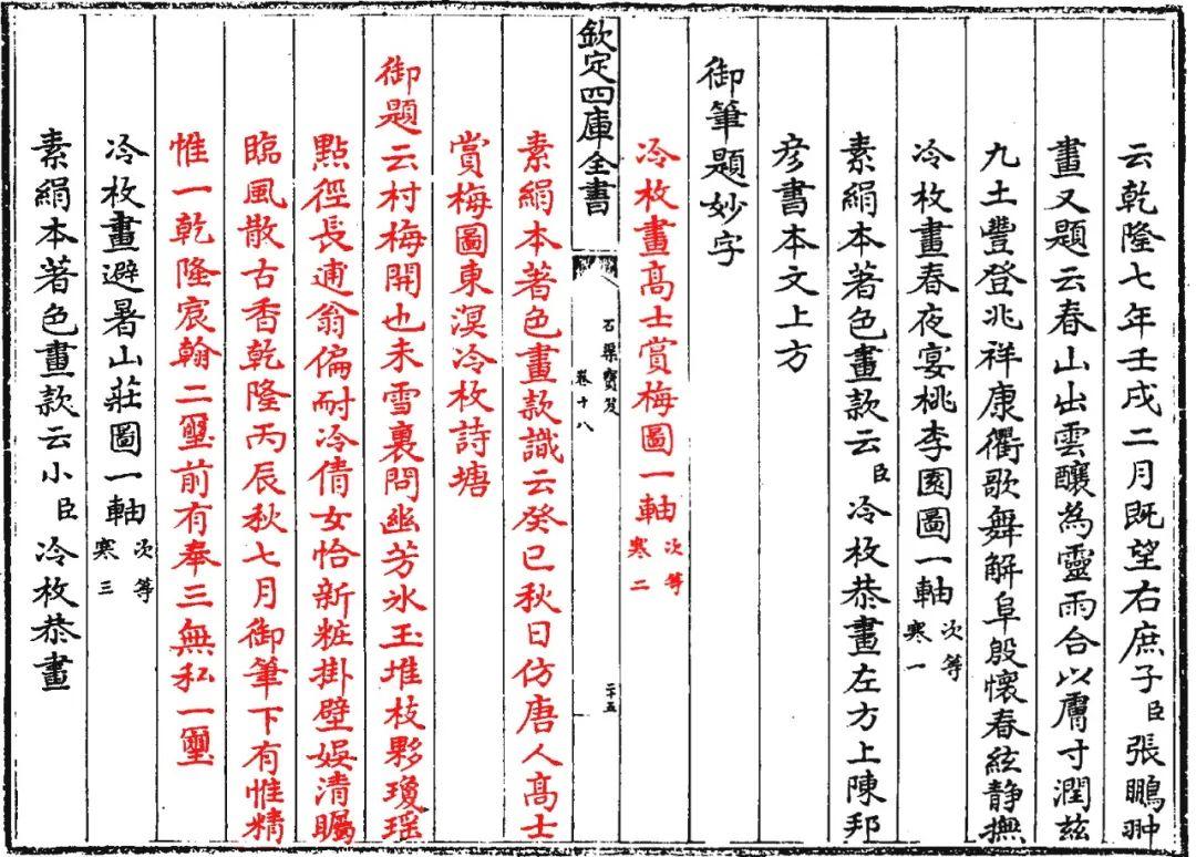 弘历继位后,于乾隆元年(1736)便马上召冷枚回画院,虽已至七十五岁之龄,但乾隆仍以特别礼遇对待,照顾到其儿子及家人之生活,钱粮也比一般画师为多;且有着将白画绢给冷枚数块之例,「令伊随意画画」,省却先起稿呈览的指定程序。