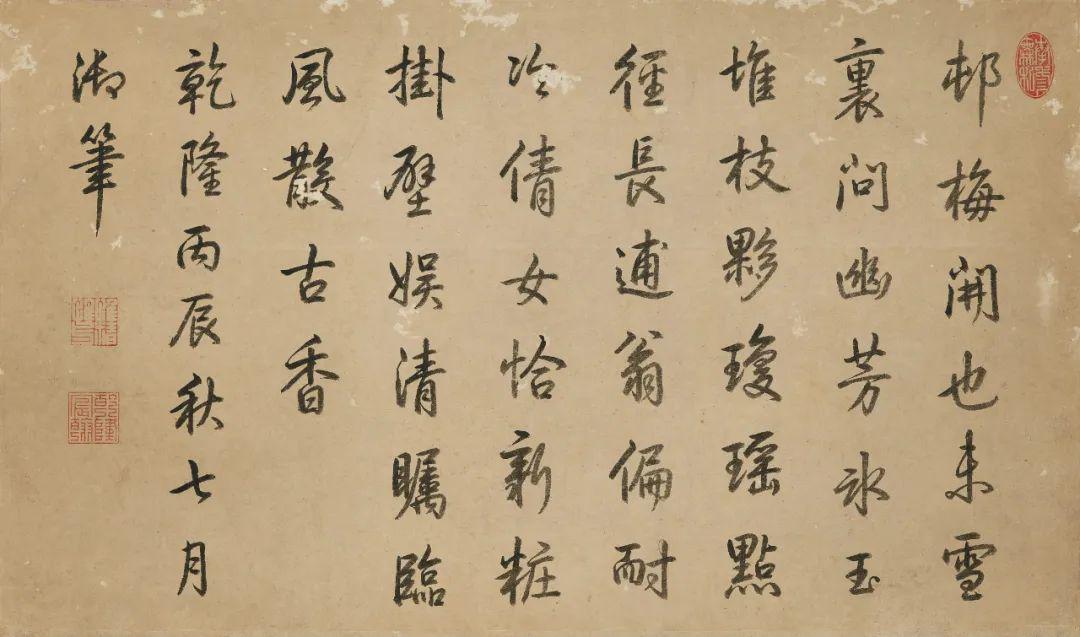(乾隆帝)村梅开也未,雪里问幽芳。冰玉堆枝伙,琼瑶点径长。逋翁偏耐冷,倩女恰新妆。挂壁娱清瞩,临风散古香。乾隆丙辰(1736)秋七月,御笔。