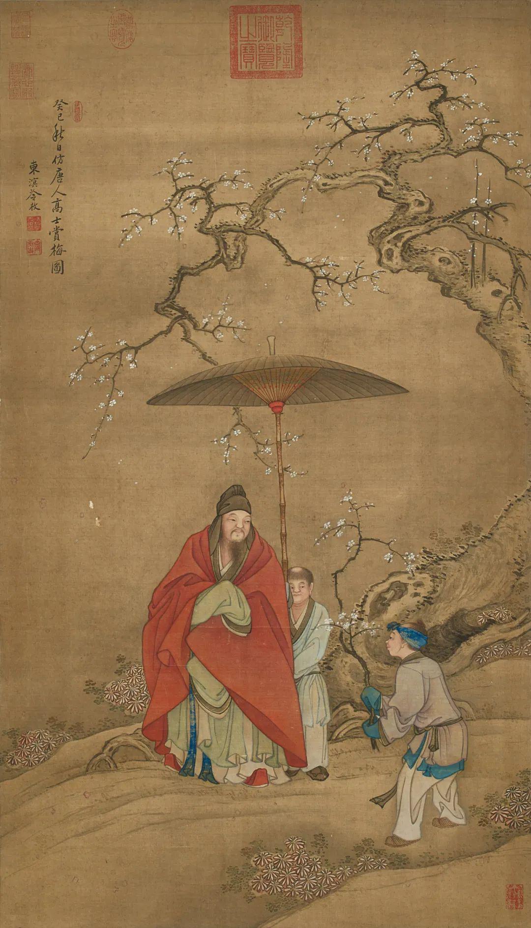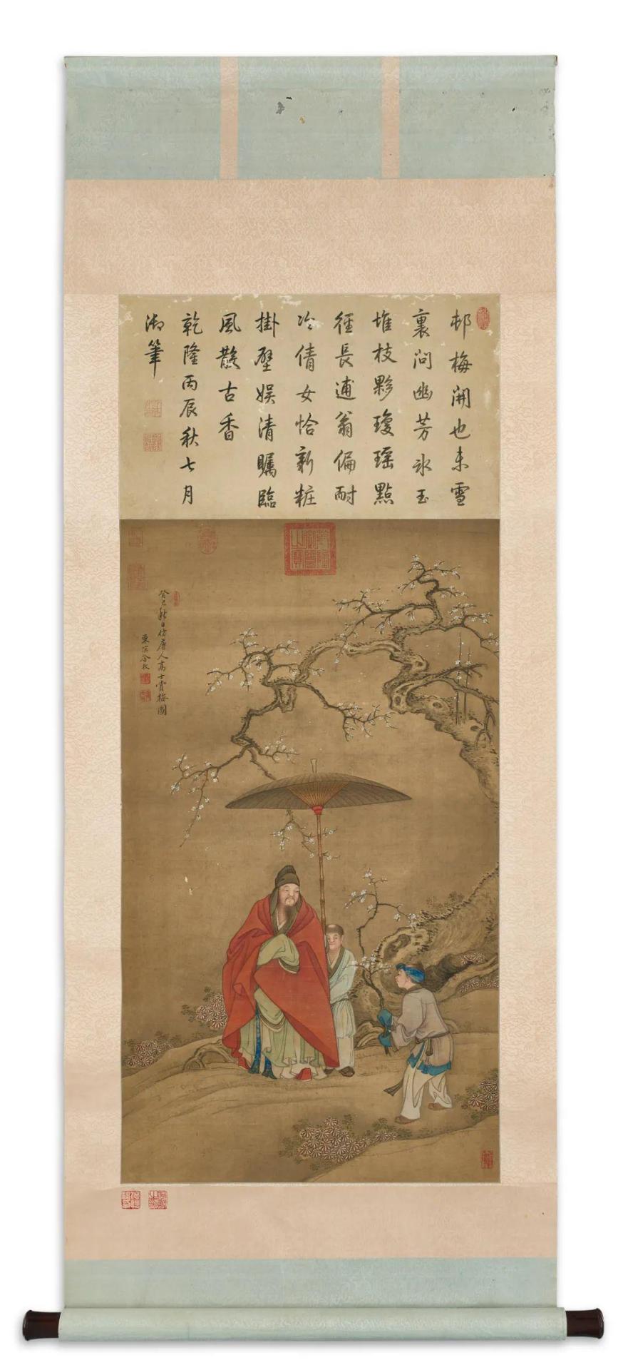 本幅作品纪年「癸巳」,仍康熙五十二年(1713),同年为冷枚再次被召入宫中领衔绘制《康熙万寿图》之时,仍他艺术生涯上的巅峰期。本作品以一曲折灵动的梅树作背景,树下有一红衣高士,在童子开伞挡雪下,寻找梅花一枝,表达手法简洁清晰。人物开脸保留传统「三白法」分染,再施以明暗渲染,塑造出立体感,用笔轻且松,带有温婉雅淡之效果。所绘之高士,虽未有文字指向,但如斯部局,已给乾隆足够的幻想空间。